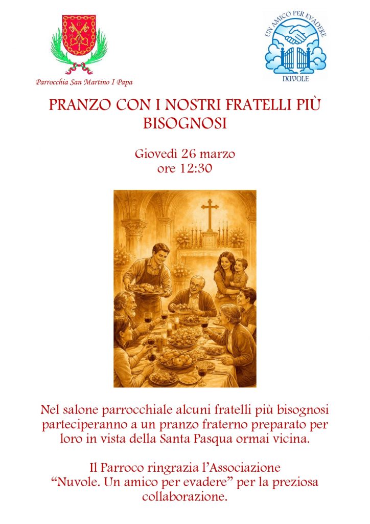 Si svolge oggi, giovedì 26 marzo alle ore 12.30, nel salone della Parrocchia San Martino I Papa, il “Pranzo con i nostri fratelli più bisognosi”, iniziativa promossa insieme all’associazione Nuvole. Un amico per evadere.