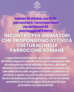 Sabato 25 ottobre, alle ore 10.00, primo incontro degli animatori di attività culturali nelle parrocchie romane, presso San Tommaso Moro, in via dei Ramni 40.