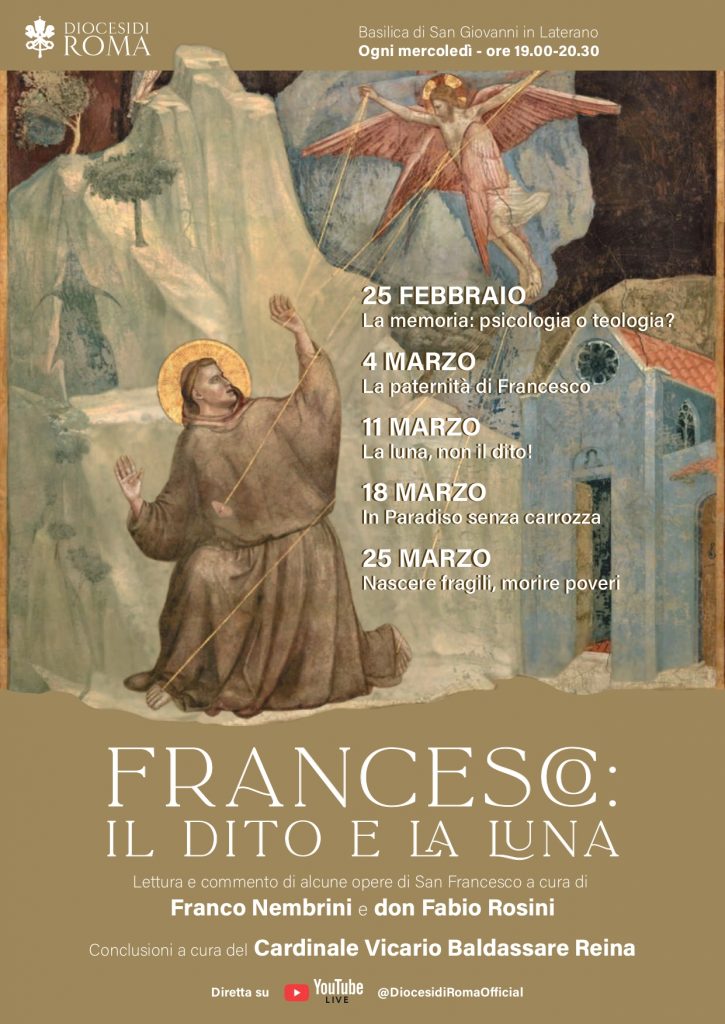 Saranno dedicati a san Francesco d’Assisi i quaresimali promossi dalla diocesi di Roma e realizzati da Francesco Nembrini e don Fabio Rosini. Una tradizione ormai consolidata vede, infatti, il saggista e il biblista protagonisti di una serie di incontri, nei mercoledì di Quaresima, dalle ore 19 fino alle 20.30, nella basilica di San Giovanni in Laterano. Ogni appuntamento verrà concluso dalle riflessioni del cardinale vicario Baldo Reina.