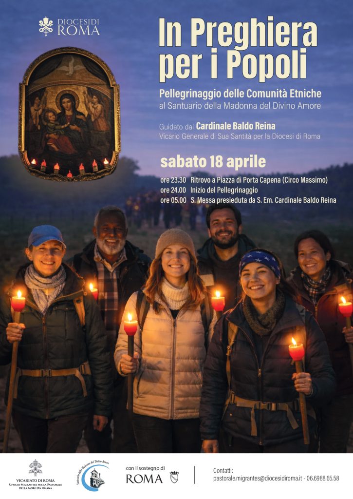 Si parte la sera di sabato 18 aprile alle 23.30, da piazza di Porta Capena, e si conclude nella mattina di domenica 19 aprile, con la Messa celebrata alle 5 al Santuario della Madonna del Divino Amore dal cardinale vicario Baldo Reina. Sarà proprio il porporato a guidare il pellegrinaggio notturno “In preghiera per i popoli”, promosso dall’Ufficio Migrantes della diocesi di Roma, con il sostegno di Roma Capitale.