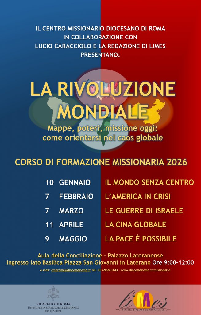Nasce dalla collaborazione tra il Centro per la Cooperazione Missionaria tra le Chiese e la rivista italiana di geopolitica Limes il nuovo corso di formazione missionaria promosso dal Centro Missionario Diocesano della diocesi di Roma, che prenderà il via il prossimo 10 gennaio.