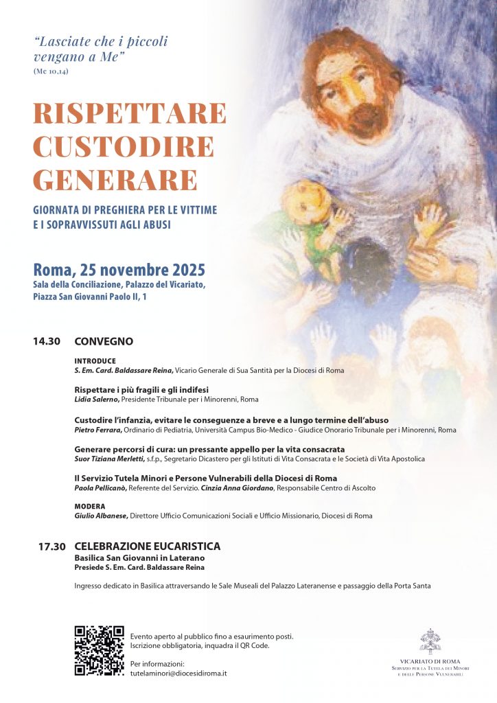 In occasione della V Giornata nazionale di preghiera per le vittime e i sopravvissuti agli abusi nella Chiesa (celebrata il 18 novembre), la diocesi di Roma organizza un momento di riflessione dal titolo “Rispettare, custodire, generare”, in programma martedì 25 novembre dalle ore 14.30 nell’Aula della Conciliazione del Palazzo Lateranense. Al termine, alle ore 17.30, si terrà la celebrazione eucaristica nella basilica di San Giovanni in Laterano, presieduta dal cardinale vicario Baldo Reina.