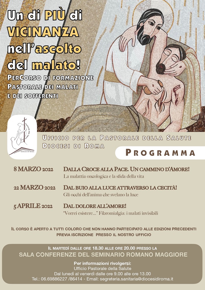 Tutto pronto per la terza edizione del percorso di Pastorale dei malati dal titolo: “Un di più di Vicinanza”. Potranno iscriversi le persone, munite di green pass, che invieranno presso la segreteria il modulo compilato. Il termine massimo per l’iscrizione saranno le ore 12 dell’8 marzo.
