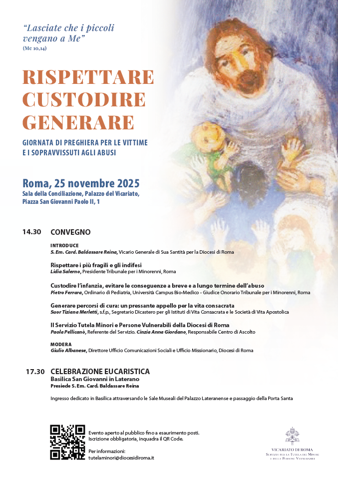 “Rispettare, Custodire, Generare”. Il titolo del momento di riflessione e formazione, in programma il 25 novembre, organizzato dall’Ufficio per la Tutela dei minori e delle persone vulnerabili del Vicariato di Roma in occasione della V Giornata nazionale di preghiera per le vittime e i sopravvissuti agli abusi.