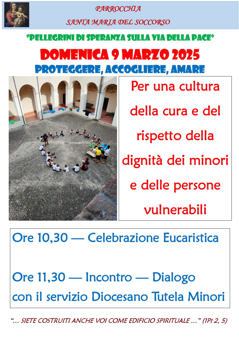 Domenica 9 marzo incontro per riflettere sulla cultura della cura e della dignita dei minori edelle persone vulnerabili nella parrocchia Santa Maria del Soccorso.