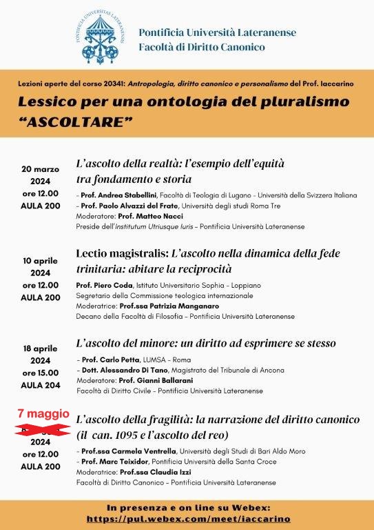 martedì 7 maggio 2024 – ore 12      “L’ascolto della fragilità: la narrazione del diritto canonico (il can. 1095 e l’ascolto del reo)”