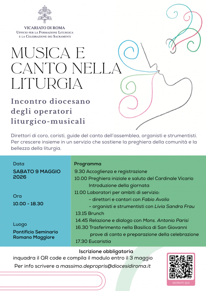L’Ufficio per la formazione liturgica e la celebrazione dei sacramenti promuove per sabato 9 maggio 2026, presso il Pontificio Seminario Romano Maggiore, l’incontro diocesano “Musica e Canto nella liturgia”, rivolto a direttori di coro, coristi, guide del canto dell’assemblea, organisti e strumentisti. La giornata si svolgerà dalle 10.00 alle 18.30, con accoglienza e registrazione a partire dalle 9.30.