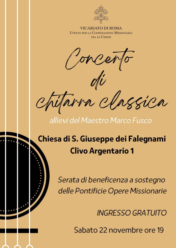 Una serata di musica e talento dedicata alla solidarietà quella di sabato 22 novembre alle ore 19 nella Chiesa di San Giuseppe dei Falegnami ai Fori Imperiali. Protagonisti del concerto saranno i giovani chitarristi Adriano Massimi, Filippo D’Arrigo, Matteo Buzzetti e Riccardo Perilli, allievi del Maestro Fusco, musicisti che, nonostante la loro giovane età, vantano già numerose esperienze in concerti e riconoscimenti in concorsi nazionali.